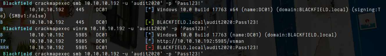 SMB 10.10.10.192 5985 DC01 [*] Windows 10.0 Build 17763 (name:DC01) (domain:BLACKFIELD.local)