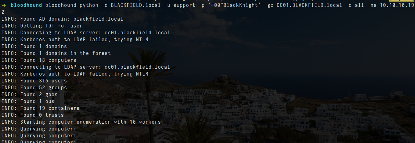 bloodhound-python -d BLACKFIELD.local -u support -p '#00^BlackKnight' -gc DC01.BLACKFIELD.local -c all -ns 10.10.10.192