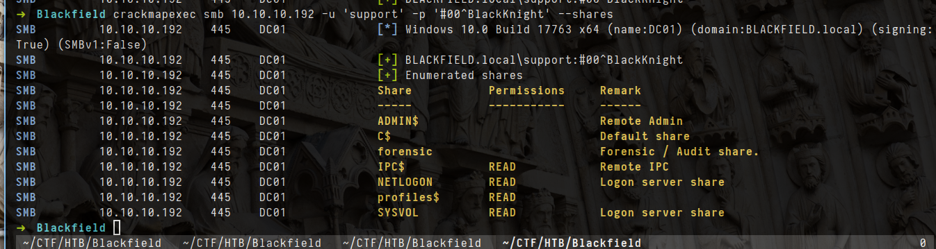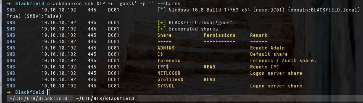 SMB 10.10.10.192 445 DC01 [*] Windows 10.0 Build 17763 x64 (name:DC01) (domain:BLACKFIELD.local) (signing:True) (SMBv1:False)