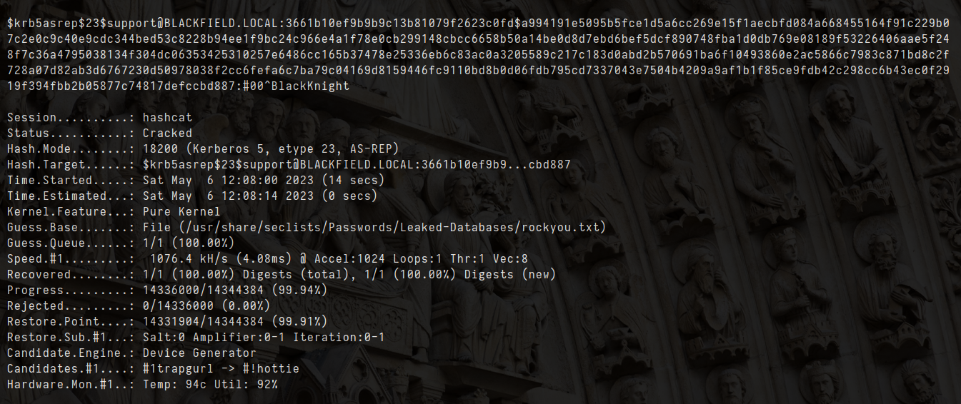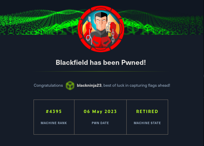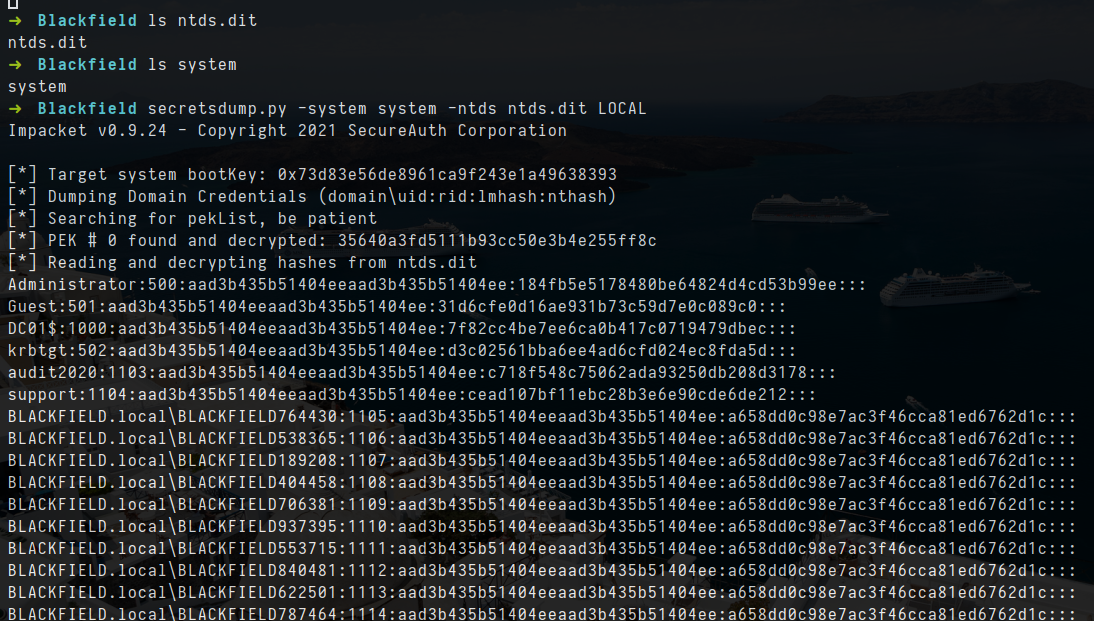Blackfield machine involve usage of username discovered via guest session of smb and by checking for Asreproasting for any account and found one of account has it and with cracking of hashes of that account and got password of that account and it is support account.With use of bloodhound, i can see that support group have ability to forcechangepassword in one of account and by change password of that account then i have ability to use that account.The account in which i just change its password has folder shared called forensic in which i dump lsass and with it, i can dump hash of svc_backup.With use of pass the hash, i can login as svc_backup.This user svc_backup has priviledge called SeBackupPrivilege.With priviledge, i can do backup of ntds.dit and system and finally dump hashes of domain controllers.After dumping hashes of domain controllers, i will use administrator’s hash and login as Administrator