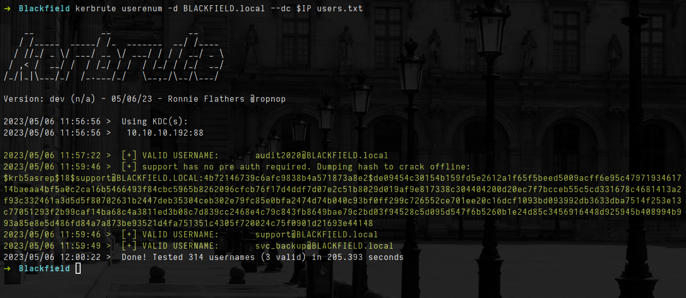 kerbrute userenum -d BLACKFIELD.local --dc $IP users.txt