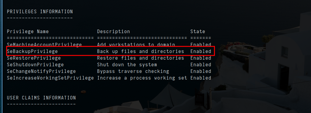 - i do have SeBackupPrivilege priviledge in which i will backup sam and system and i will use pass the hash of administrator