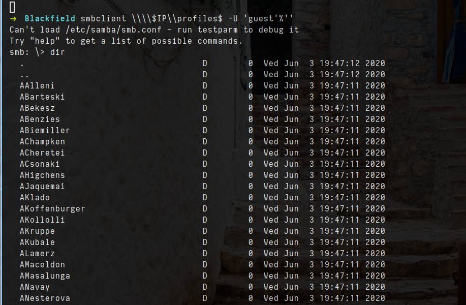 smbclient \\\\$IP\\profiles$ -U 'guest'%'' -c 'dir'|tee dummydata.txt