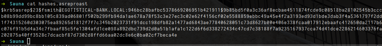 Hash.Target......: $krb5asrep$23$fsmith@EGOTISTICAL-BANK.LOCAL:946bc28...beca4e
